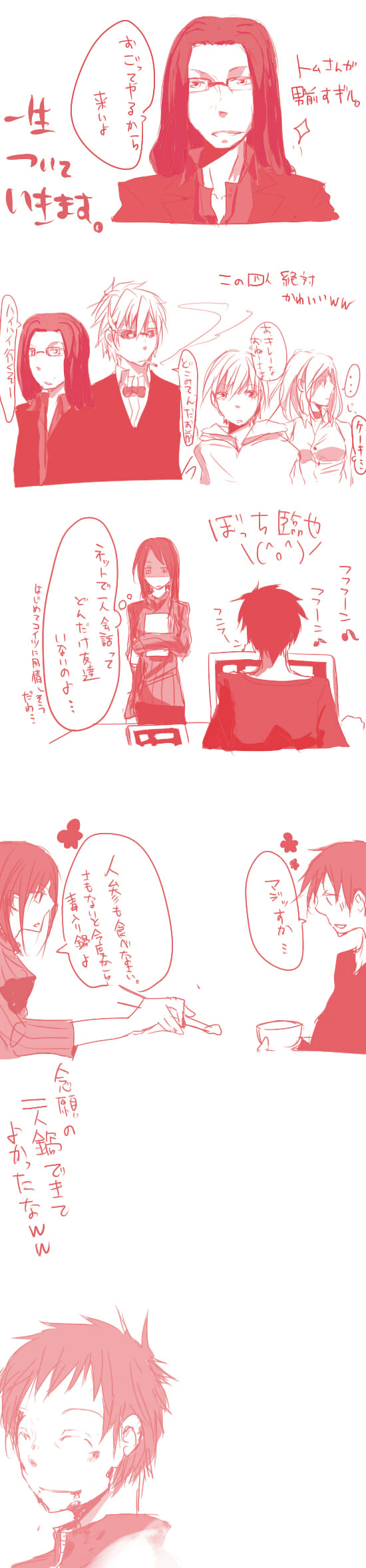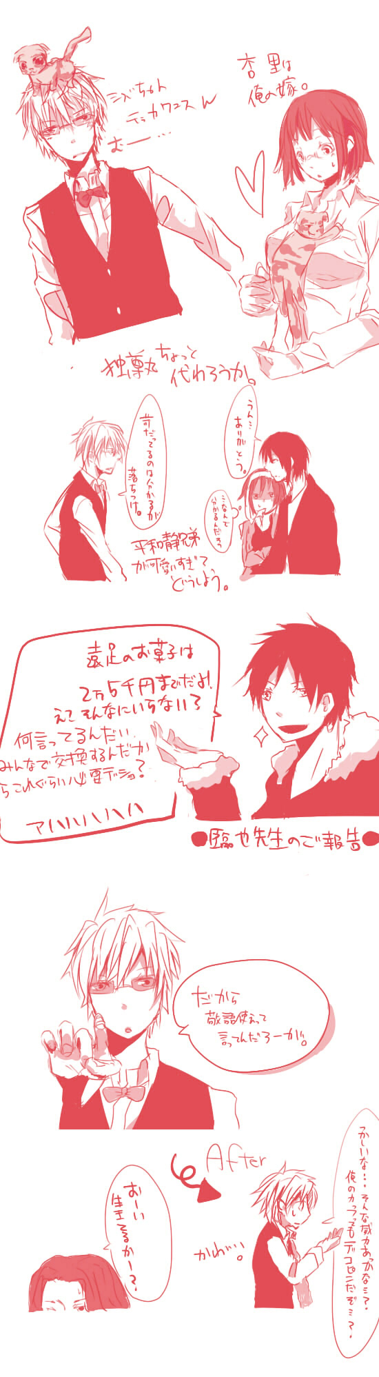 味覚戻ってて苦いのが無理とか萌えるじゃないか。というかこの絵を見てたらどれだけじろうが萌え袖好きかということがありありと分かる。キリッとしてらっしゃる新羅さんが犯人です。